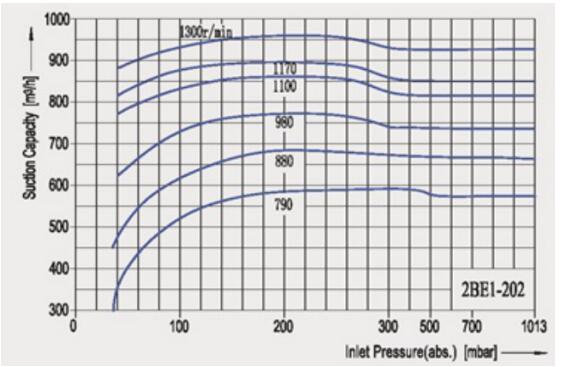 The flat port pump remains stable capacity from atmosphere to its ultimate vacuum. The efficiency is high especially from 200mbar to 1atm. Below curve for reference.